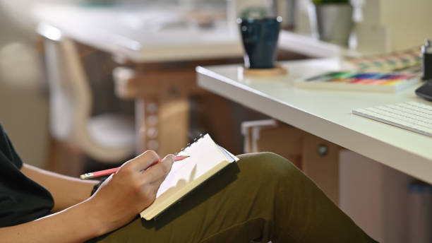 Feuilles, stylos, crayons de couleur